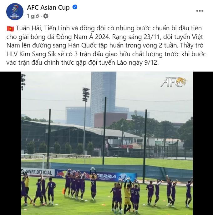 Cụ thể, trên fanpage chính thức, AFC đã đăng tải video buổi tập vào sáng ngày 22/11 của ĐT Việt Nam cùng dòng trạng thái: "Tuấn Hải, Tiến Linh và đồng đội có những bước chuẩn bị đầu tiên cho giải bóng đá Đông Nam Á 2024.