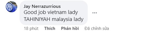 CĐV Jay Nerrazurrious dành lời khen cho màn thể hiện của ĐT U20 nữ Việt Nam trước đối thủ vượt trội hơn là Trung Quốc: "Làm tốt lắm các quý cô Việt Nam, gửi từ Malaysia".