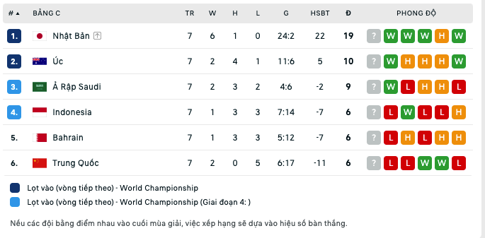 Với cục diện bảng C lúc này, cả Indonesia và Bahrain đều khó có thể "mơ" lọt vào top 2 đội đầu bảng có vé trực tiếp dự World Cup 2026 (nơi ĐT Nhật Bản - 19 điểm và ĐT Úc - 10 điểm đang thống trị). Nhật Bản là đội đầu tiên có vé dự VCK World Cup.