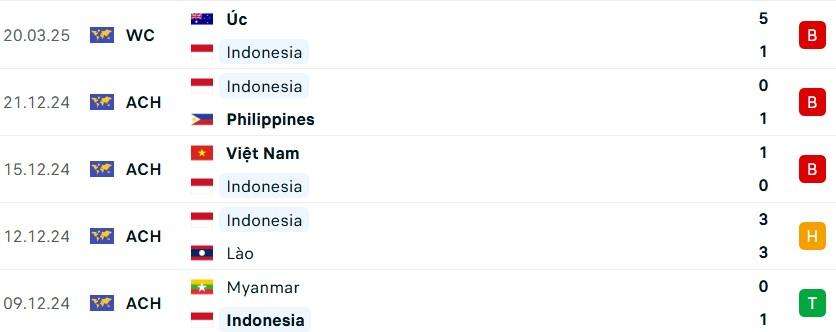 - Phong độ gần đây của Indonesia: 1 thắng, 1 hòa, 3 thua