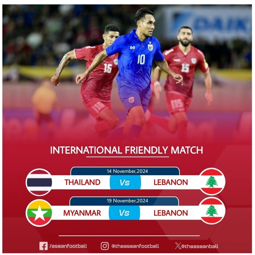 Cụ thể, trận giao hữu giữa ĐT Thái Lan với ĐT Lebanon diễn ra vào ngày 14/11. 5 ngày sau đó (tức ngày 19/11), tuyển Myanmar sẽ bước vào cuộc đọ sức với đại diện đến từ khu vực Trung Đông.
