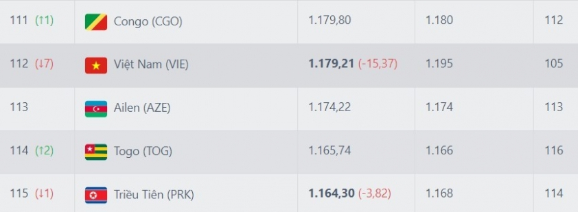 Còn ĐT Philippines dù chỉ thua 0-1 ĐT Iraq nhưng dự kiến bị trừ 5,61 điểm; tụt 2 bậc (từ hạng 139 xuống hạng 141). Như vậy, có thể thấy rằng thứ hạng của ĐT Việt Nam đang ngày cảng sụt giảm và rơi vào tình trạng đáng báo động.