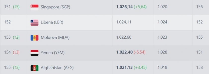 Đội cuối cùng được FIFA "thưởng quà" là Singapore, họ đã gây bất ngờ lớn khi cầm hòa 2-2 ĐT Trung Quốc. Nhờ vậy, Singapore được cộng 5,64 điểm đồng thời tăng 5 bậc (từ hạng 156 lên hạng 151).
