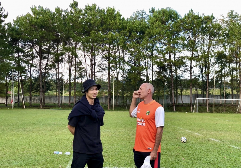 Công Phượng dành thời gian trò chuyện với HLV Guillaume Graechen. Thầy Giôm chính là người thầy đầu tiên của lứa Công Phượng, Văn Toàn, Tuấn Anh tại đội bóng phố Núi.