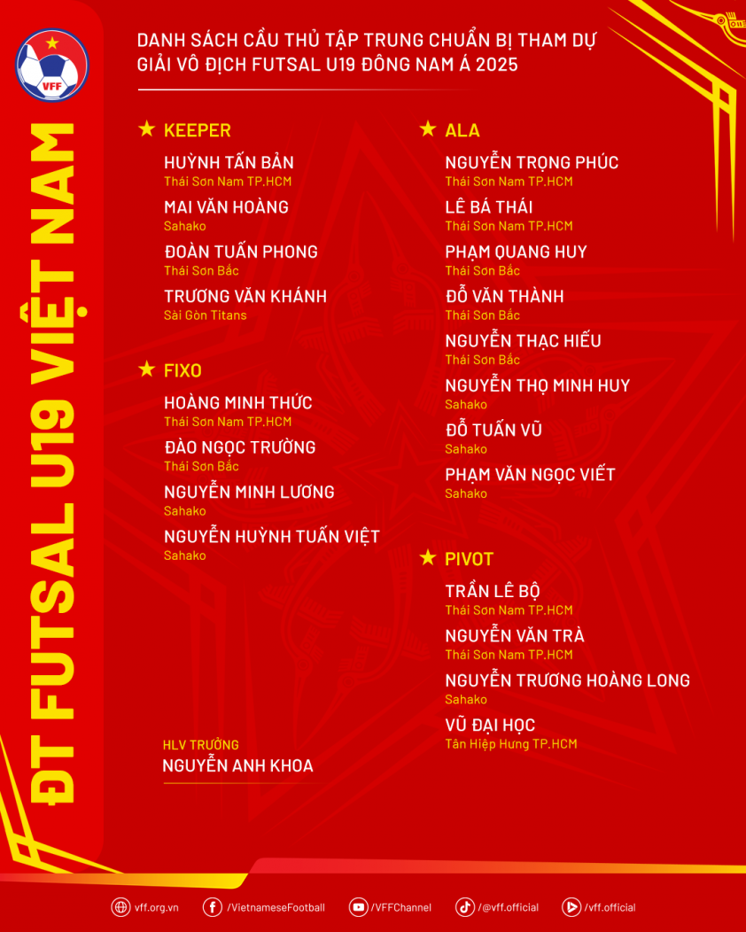 Công bố danh sách U16 và U19 futsal Việt Nam tham dự 2 giải Đông Nam Á vào cuối năm 2025.