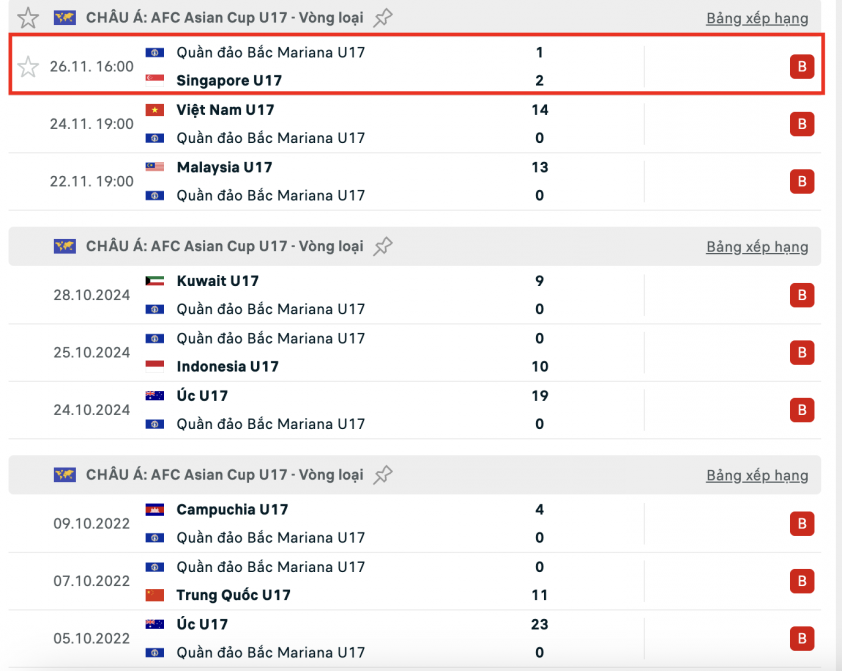 Ở lượt trận thứ 3 vòng loại U17 châu Á 2026, U17 QĐ Bắc Mariana dù vẫn để thua nhưng chỉ còn nhận thất bại với cách biệt tối thiểu với tỷ số 1-2 trước Singapore. Đáng chú ý, pha lập công vào lưới Singapore là bàn thắng đầu tiên của QĐ Bắc Mariana trong lịch sử tham dự vòng loại U17 châu Á.