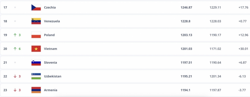 Theo BXH FIFA futsal chính thức mới được LĐBĐ Thế giới cập nhật, ĐT futsal Việt Nam tăng tới 6 bậc, leo 1 mạch từ vị trí 26 lên top 20 thế giới. Thầy trò HLV Diego Giustozzi được cộng tới +30.01 điểm, tăng từ 1171.02 lên 1201.03 điểm. Đây là thành rất ấn tượng của ĐT futsal Việt Nam.