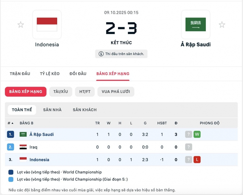 Nhìn chung dù đã thua Ả Rập Xê Út nhưng Indonesia thậm chí vẫn còn có cơ hội đứng nhất bảng và giành vé trực tiếp tham dự VCK World Cup 2026. Cụ thể nếu Indonesia thắng đậm Iraq ở lượt trận tiếp theo còn Iraq lại thắng Ả Rập Xê Út ở lượt cuối, 3 đội sẽ đều có cùng 3 điểm.