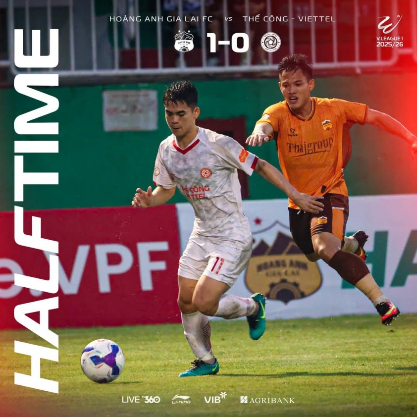 Bước ngoặt của hiệp một đến ở phút 26. Từ một quả đá phạt chính xác của Hoàng Vĩnh Nguyên, trung vệ Jairo bật cao đánh đầu hiểm hóc, mở tỷ số 1-0 cho HAGL trong sự bất lực của hàng thủ Viettel. Sau bàn thắng, HAGL tiếp tục chơi ấn tượng. Phút 30, Phan Du Học thử tài thủ môn Văn Việt bằng cú sút xa uy lực. Viettel nỗ lực tấn công bên cánh phải với sự cơ động của Trương Tiến Anh và Pedro, nhưng hàng thủ HAGL vẫn đứng vững. Hiệp một kết thúc với tỷ số 1-0 nghiêng về đội chủ nhà.