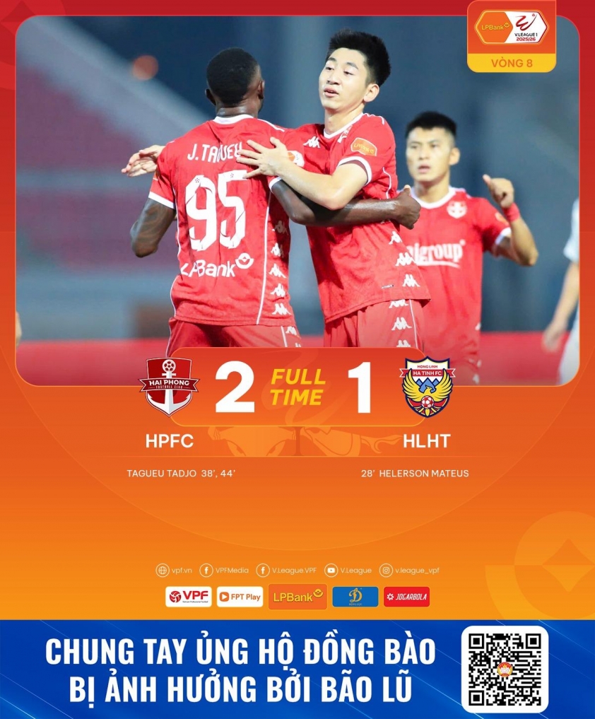 (Kết quả bóng đá) - Tagueu ghi cả 2 bàn thắng giúp Hải Phòng ngược dòng đánh bại Hà Tĩnh trên sân nhà.