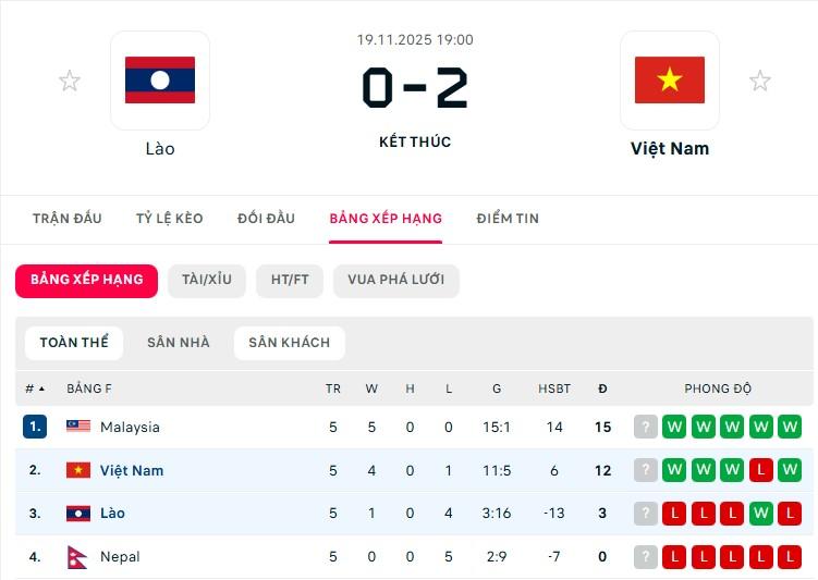ĐT Việt Nam và Malaysia đều thắng ở lượt trận thứ 5 vòng loại Asian Cup 2027. Ở bảng F hiện tại, Malaysia dẫn đầu với 15 điểm, ĐT Việt Nam có 12 điểm xếp thứ 2. Vì thế nếu muốn đi tiếp thì ở lượt trận cuối, ĐT Việt Nam sẽ cần phải thắng Malaysia với cách biệt 4 bàn trở lên do đã thua 0-4 ở trận lượt đi.
