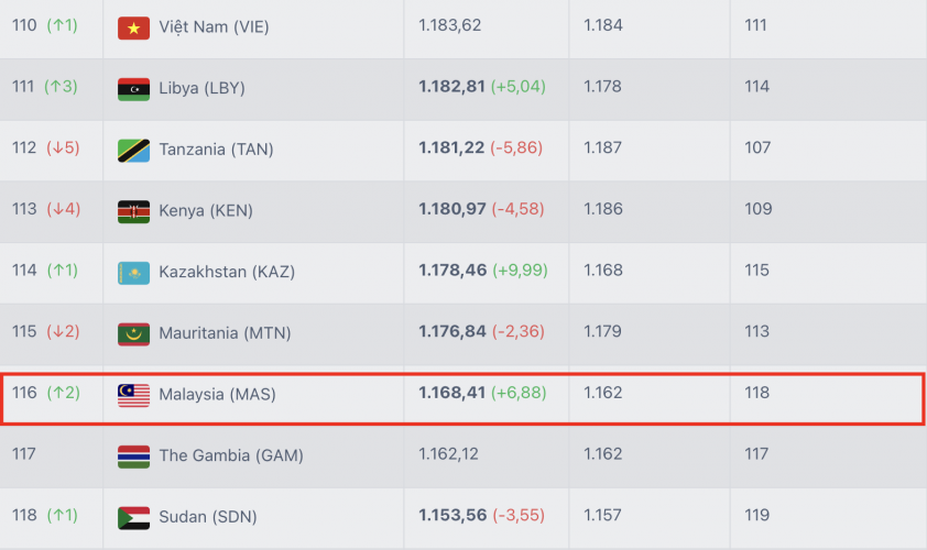 Trong khi đó, ĐT Việt Nam hiện tại đang đứng thứ 111 thế giới với 1183.62 điểm. Với 25 điểm được công thêm khi được xử thắng Malaysia 3-0, "Rồng Vàng" sẽ có tới 1208.62 điểm, vươn lên vị trí thứ 104 thế giới. Đây sẽ là cơ hội rất tốt để ĐT Việt Nam trở lại top 100 trên BXH FIFA nếu như tiếp tục giành chiến thắng trước Lào (tháng 11) và Malaysia (tháng 3/2026) tại vòng loại Asian Cup.