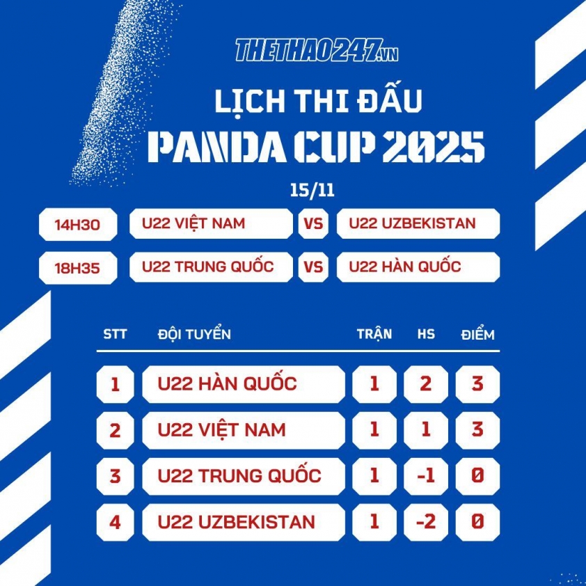 Tối 12/11, trên sân Chengdu Shuangliu Sport Center Stadium (Thành Đô, Tứ Xuyên), đội tuyển U22 Việt Nam đã khởi đầu thuận lợi tại Giải bóng đá quốc tế CFA Team China – Panda Cup 2025 khi vượt qua chủ nhà U22 Trung Quốc với tỷ số 1-0, nhờ pha lập công duy nhất của Phạm Minh Phúc ở hiệp hai.