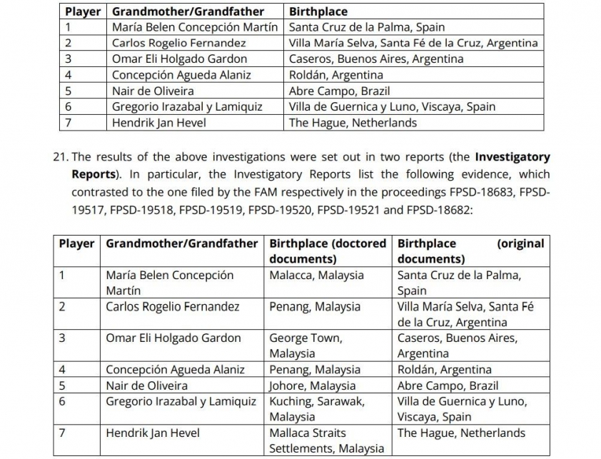 Cụ thể, FIFA đang nắm trong tay bản gốc giấy tờ khai sinh của ông hoặc bà 7 cầu thủ Malaysia nhập tịch kể trên. So với giấy tờ đã được sửa đổi để nhập tịch trái phép, cả ông hoặc bà của 7 cầu thủ nhập tịch trái phép này đều không phải sinh ra ở Malaysia. Theo giấy tờ khai sinh gốc, họ sinh ra ở các quốc gia phương Tây như Hà Lan, Argentina, Brazil và cả Tây Ban Nha.