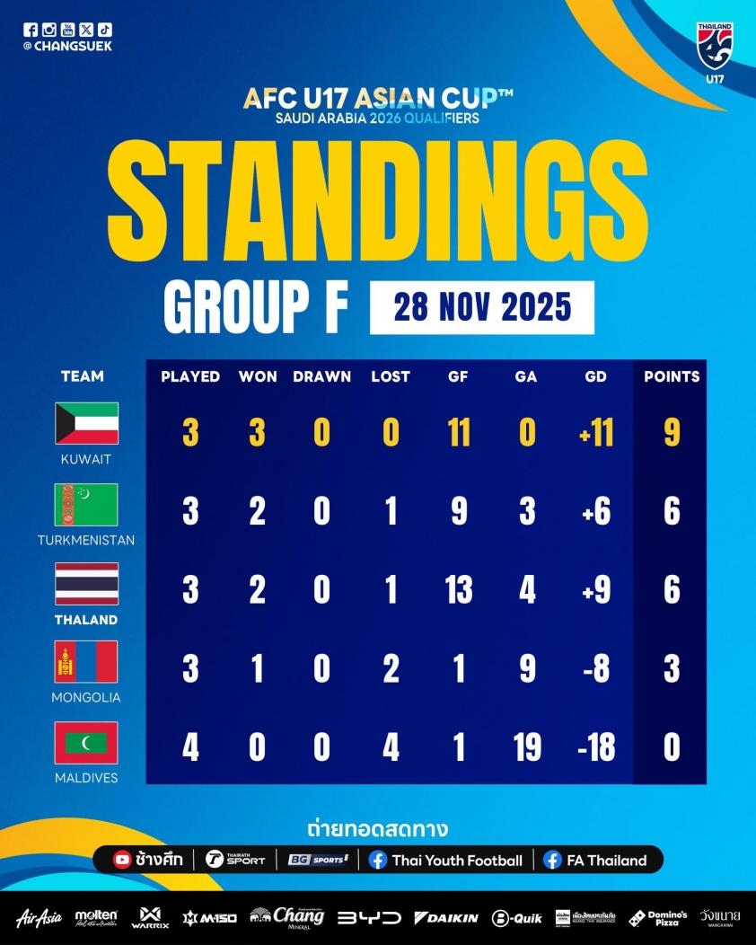 Trong thời gian còn lại, U17 Thái Lan tạo ra nhiều cơ hội nhưng không thể gỡ hòa. Trận thua 2-3 khiến U17 Thái Lan rơi xuống vị trí thứ 3 của bảng F với 6 điểm. Nếu không thắng đội đầu bảng Kuwait ở lượt trận cuối, Thái Lan sẽ chính thức bị loại. Ngay cả trong trường hợp U17 Thái Lan thắng Kuwait mà Turkmenistan thắng Mông Cổ, U17 Thái Lan cũng bị loại vì thua thành tích đối đầu.