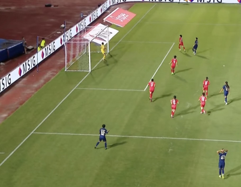 Pha treo bóng vào trong rất xoáy của 1 cầu thủ Thái Lan đưa bóng chạm xà ngang khung thành. Thủ môn Kim Thanh hoàn toàn bị bất ngờ.