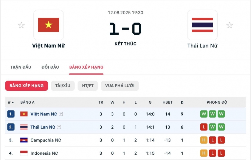 Cục diện bảng A giải bóng đá nữ Đông Nam Á 2025 gần như đã an bài ở sau 2 lượt trận đầu tiên. Cả ĐT nữ Việt Nam và Thái Lan đều dễ dàng thắng đậm Campuchia và Indonesia và đã chắc chắn đi tiếp. Cuộc đối đầu giữa 2 đội ở lượt trận cuối cùng sẽ chỉ còn ý nghĩa xác định ngôi đầu bảng xếp hạng khi vào bán kết.