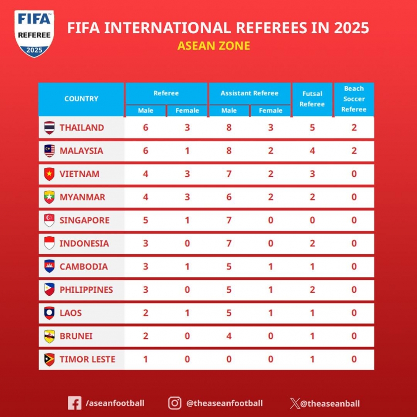 Trong khi đó, Thái Lan đứng đầu khu vực Đông Nam Á về số lượng các trọng tài FIFA với 6 trọng tài, 8 trợ lý trọng tài FIFA nam, 3 trọng tài, 3 trợ lý trọng tài FIFA nữ, 5 trọng tài FIFA futsal. Đứng thứ 2 khu vực là Malaysia với con số cũng không mấy kém cạnh.