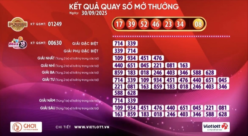 Trong ngày 2/10/2025, sẽ tiến hành quay các giải các giải Vietlott Power 6/55.
