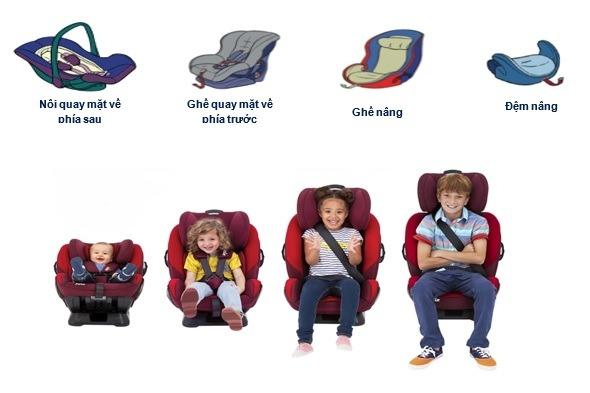Ghế an toàn cho trẻ được chia theo nhóm cân nặng và độ tuổi để phù hợp với từng giai đoạn phát triển:
