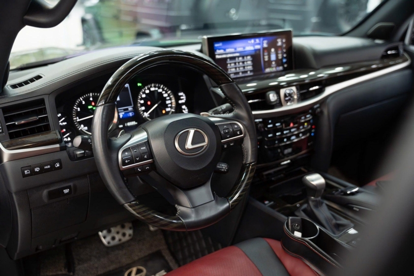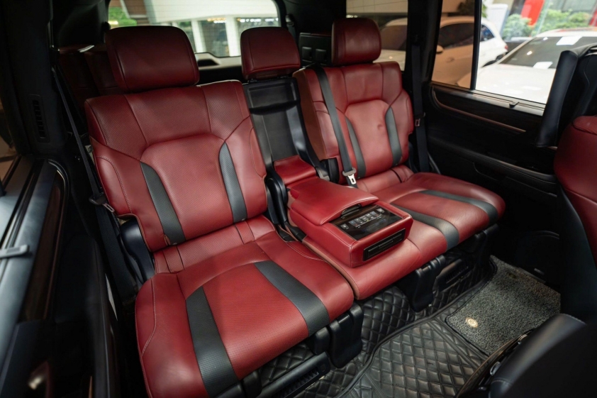 Bước vào khoang nội thất, Lexus LX 570 Super Sport 2019 toát lên phong thái của một chiếc "chuyên cơ mặt đất". Chiếc xe được rao bán sử dụng phối màu đỏ - đen cá tính, kết hợp cùng gỗ Shimamoku cao cấp - chi tiết đặc trưng trên các dòng xe Lexus.