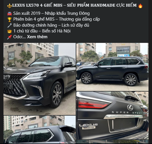 Theo tham khảo, một chiếc Lexus LX 570 MBS đời 2019 đang được rao bán tại một showroom xe sang cũ ở Hà Nội với mức giá khoảng 7,xxx tỷ đồng (có thể thương lượng).
