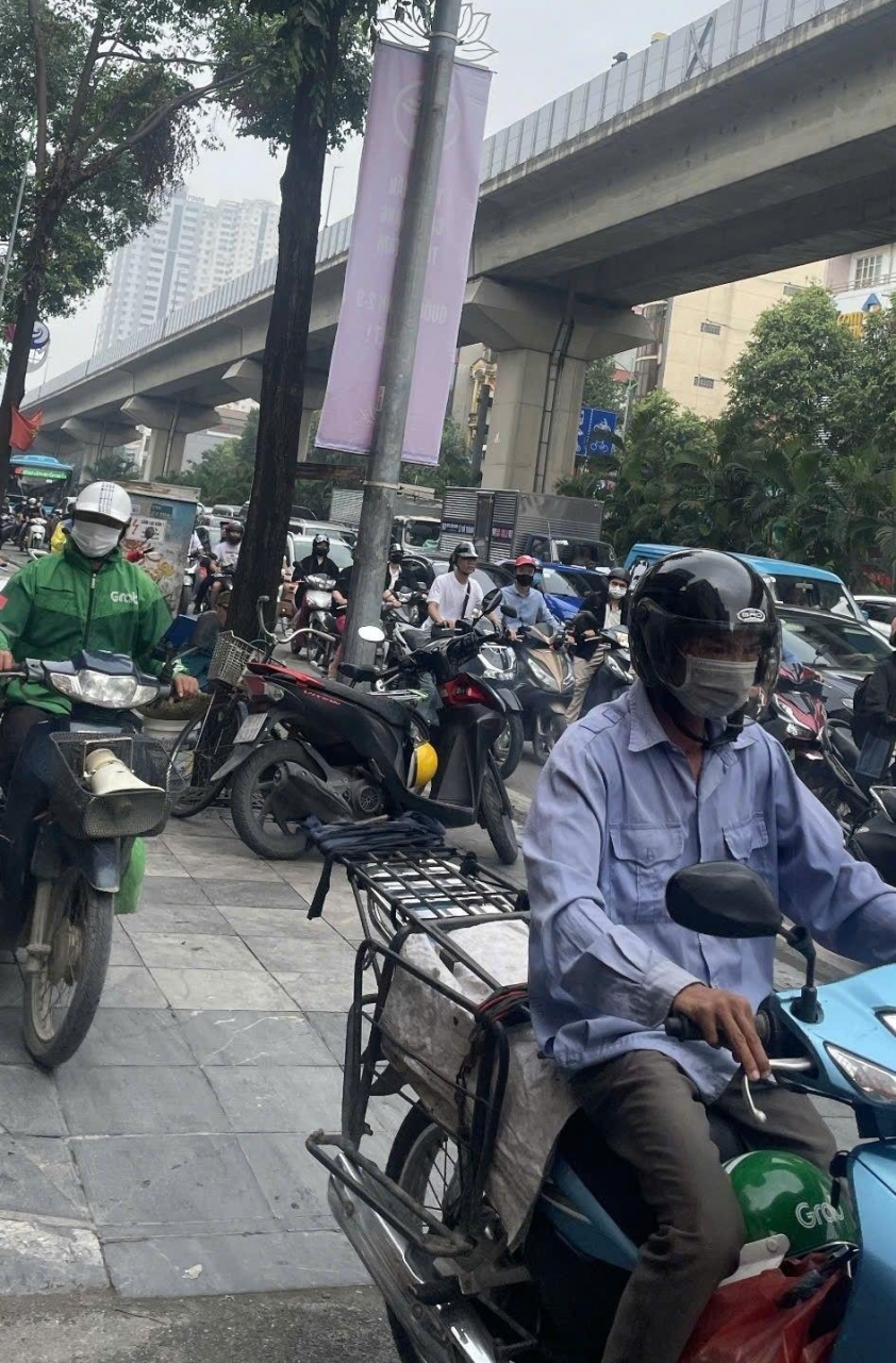 Do mặt đường ngập nặng, nhiều người đi xe máy chọn leo vỉa hè để thoát cảnh tắc nghẽn, nhưng ngay cả vỉa hè cũng chật cứng xe, không thể nhúc nhích.