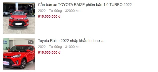 Có hai chiếc Raize với chỉ số ODO lần lượt là 31.000 và 32.000 km đang được rao bán với mức giá 515 triệu đồng. Tuy nhiên, vào năm 2022, người dùng sẽ phái bỏ ra khoảng 650 triệu đồng nếu muốn lăn bánh một chiếc Toyota Raize tại Hà Nội.