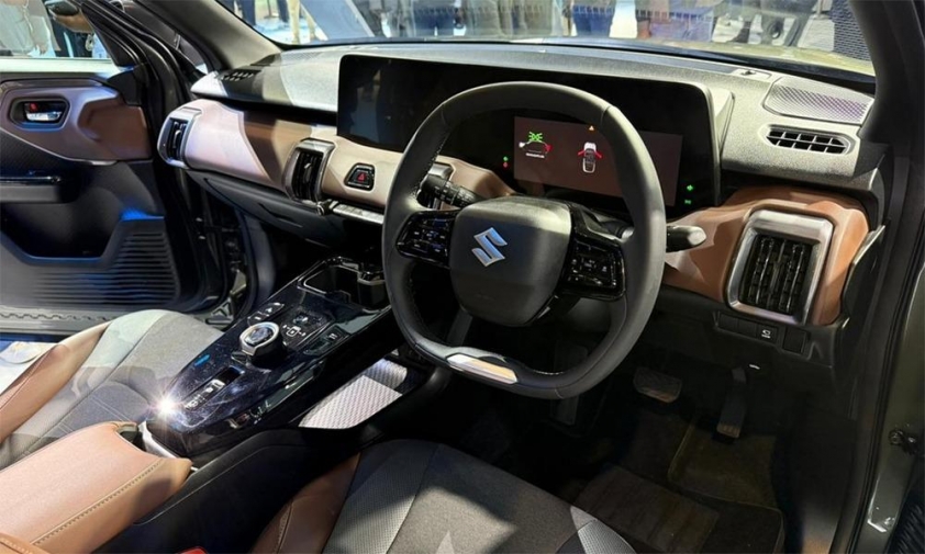 Khoang cabin của Suzuki e Vitara được trang bị nhiều tiện nghi hiện đại như vô lăng hai chấu tích hợp nút bấm chức năng, cụm đồng hồ kỹ thuật số 10,1 inch nối liền với màn hình cảm ứng trung tâm 10,25 inch, hỗ trợ Apple CarPlay/Android Auto, điều hòa tự động một vùng, sạc điện thoại không dây, núm xoay chuyển số, phanh tay điện tử, giữ phanh tạm thời, cửa sổ trời, ghế lái chỉnh điện 10 hướng, hàng ghế sau gập 60:40.