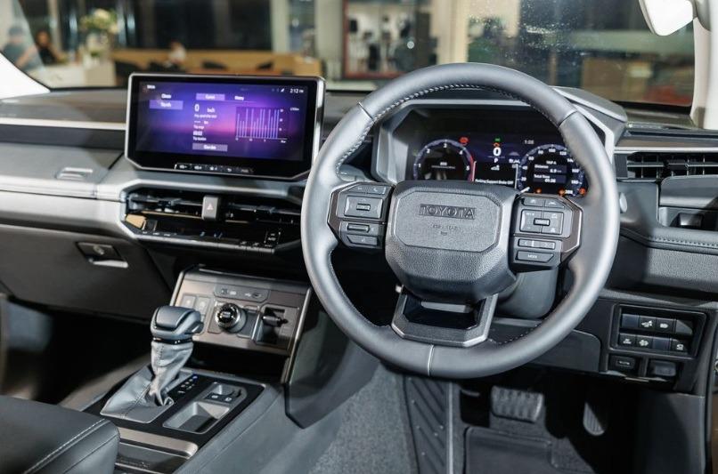 Khoang nội thất cũng được Toyota thiết kế lại hoàn toàn, mang phong cách tương đồng với Land Cruiser Prado. Nổi bật là màn hình kỹ thuật số 12,3 inch sau vô-lăng và màn hình trung tâm 12,3 inch hỗ trợ Apple CarPlay và Android Auto không dây.
