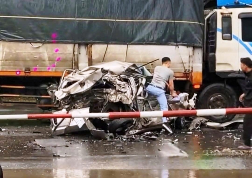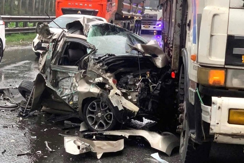 Cú va chạm mạnh khiến xe đầu kéo đâm trực diện vào đuôi ô tô con, khiến phương tiện này bị văng vào gầm sau xe tải phía trước. Cả ba xe đều bị hư hỏng nặng, trong đó chiếc ô tô con gần như bẹp rúm, biến dạng hoàn toàn.