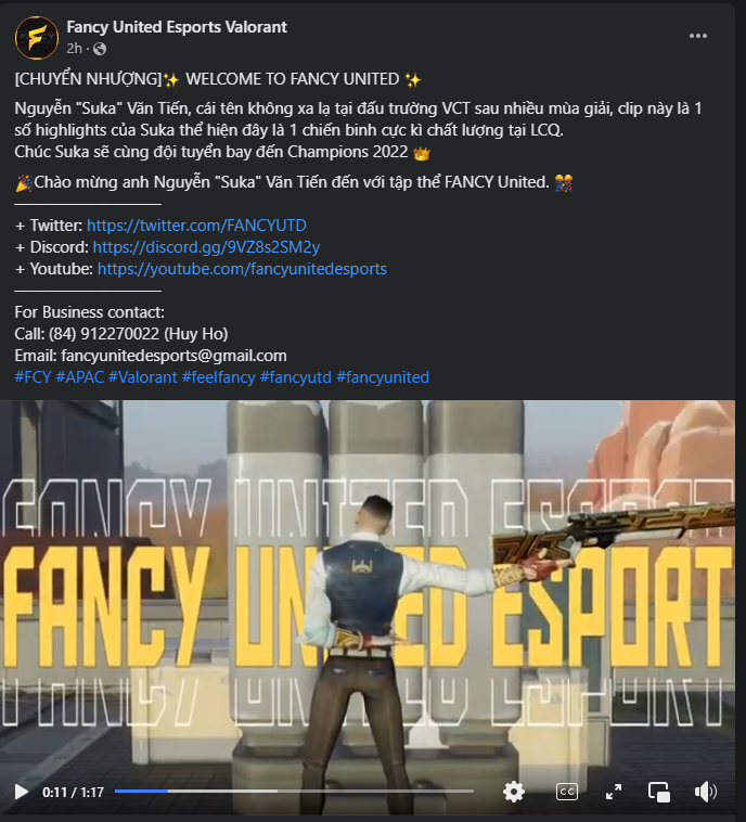 Đội tuyển Valorant, Fancy United tiếp tục thông báo với người hâm mộ một tin vui khi chiêu mộ thành công Nguyễn Văn "Suka" Tiến.