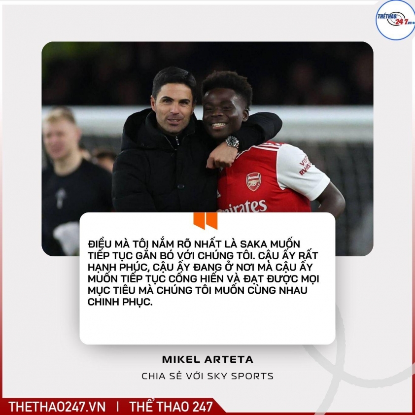 “Điều mà tôi nắm rõ nhất là Saka muốn tiếp tục gắn bó với chúng tôi. Cậu ấy rất hạnh phúc, cậu ấy đang ở nơi mà cậu ấy muốn tiếp tục cống hiến và đạt được mọi mục tiêu mà chúng tôi muốn cùng nhau chinh phục. Khi nào điều đó xảy ra và bằng cách nào, tôi để cho Saka và CLB quyết định.”