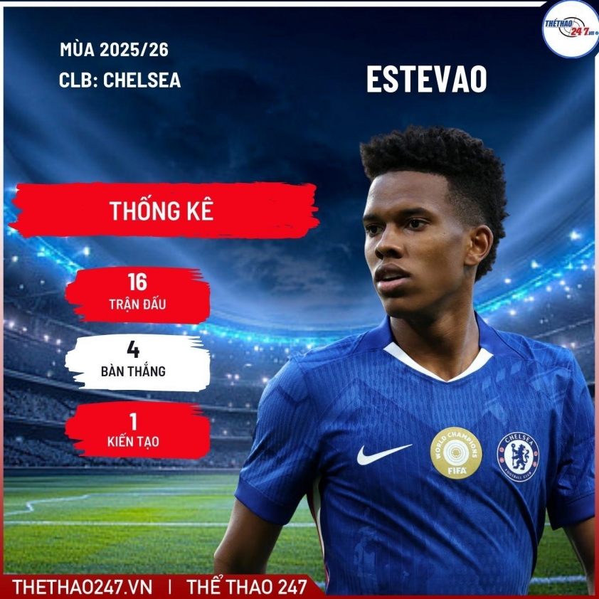 Các ông lớn Premier League đã chi một khoản phí có thể lên tới 57 triệu Euro để chiêu mộ Estevão từ Palmeiras vào năm ngoái, dù cầu thủ này được phép ở lại Brazil thi đấu trọn vẹn mùa giải vừa qua. Anh có màn ra mắt Chelsea vào tháng 8 trong trận gặp Crystal Palace và ngay lập tức trở thành cái tên được người hâm mộ đặc biệt yêu mến.