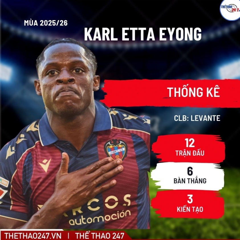 Cầu thủ 22 tuổi người Cameroon đã ghi 6 bàn và kiến tạo 3 lần sau 12 trận tại La Liga 2025/26. Phong độ chói sáng ấy giúp anh lọt vào tầm ngắm của hàng loạt ông lớn châu Âu. Barcelona hiện được xem là ứng viên hàng đầu trong cuộc đua giành chữ ký của Eyong, khi đội bóng xứ Catalonia đang tìm kiếm phương án kế thừa lâu dài cho Robert Lewandowski. Tuy nhiên, Arsenal, Manchester City, Manchester United và Real Madrid cũng đang theo dõi sát sao tình hình của anh.