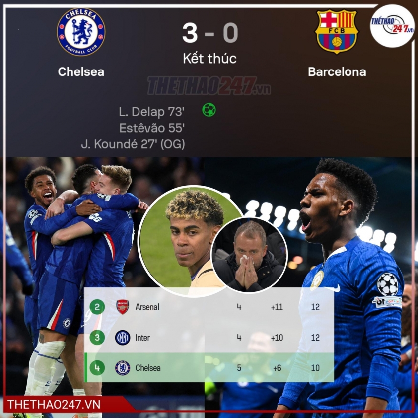 Barcelona bị dẫn 0-1 trước khi Araujo nhận thẻ đỏ, và Chelsea khép lại trận đấu bằng 3 bàn thắng trong hiệp hai do công của Estevao và Liam Delap. Thất bại này là lần thứ hai Barca trắng tay tại vòng bảng, khiến giấc mơ tiến sâu ở Champions League rơi vào tình thế báo động.