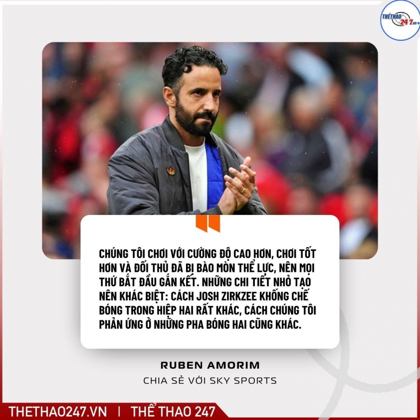 Amorim hài lòng với mức độ “cường độ” mà Man United thể hiện trong hiệp hai sau 45 phút mở màn đáng thất vọng: “Chúng tôi chơi với cường độ cao hơn, chơi tốt hơn và đối thủ đã bị bào mòn thể lực, nên mọi thứ bắt đầu gắn kết. Những chi tiết nhỏ tạo nên khác biệt: cách Josh Zirkzee khống chế bóng trong hiệp hai rất khác, cách chúng tôi phản ứng ở những pha bóng hai cũng khác. Rồi tài năng ở phía trên giúp chúng tôi ghi hai bàn.”