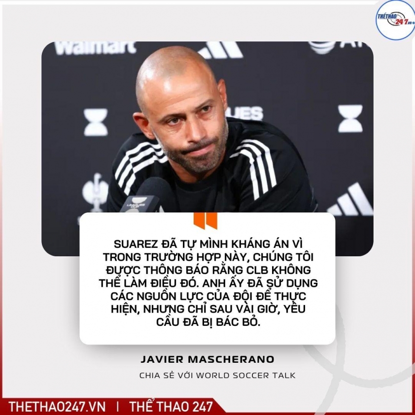 Án treo giò mà MLS dành cho Luis Suarez xuất phát từ hành vi đá vào cầu thủ người Honduras, Andy Najar. Theo Mascherano tiết lộ, ban tổ chức đã nhanh chóng từ chối đơn kháng án của cựu sao Barcelona.