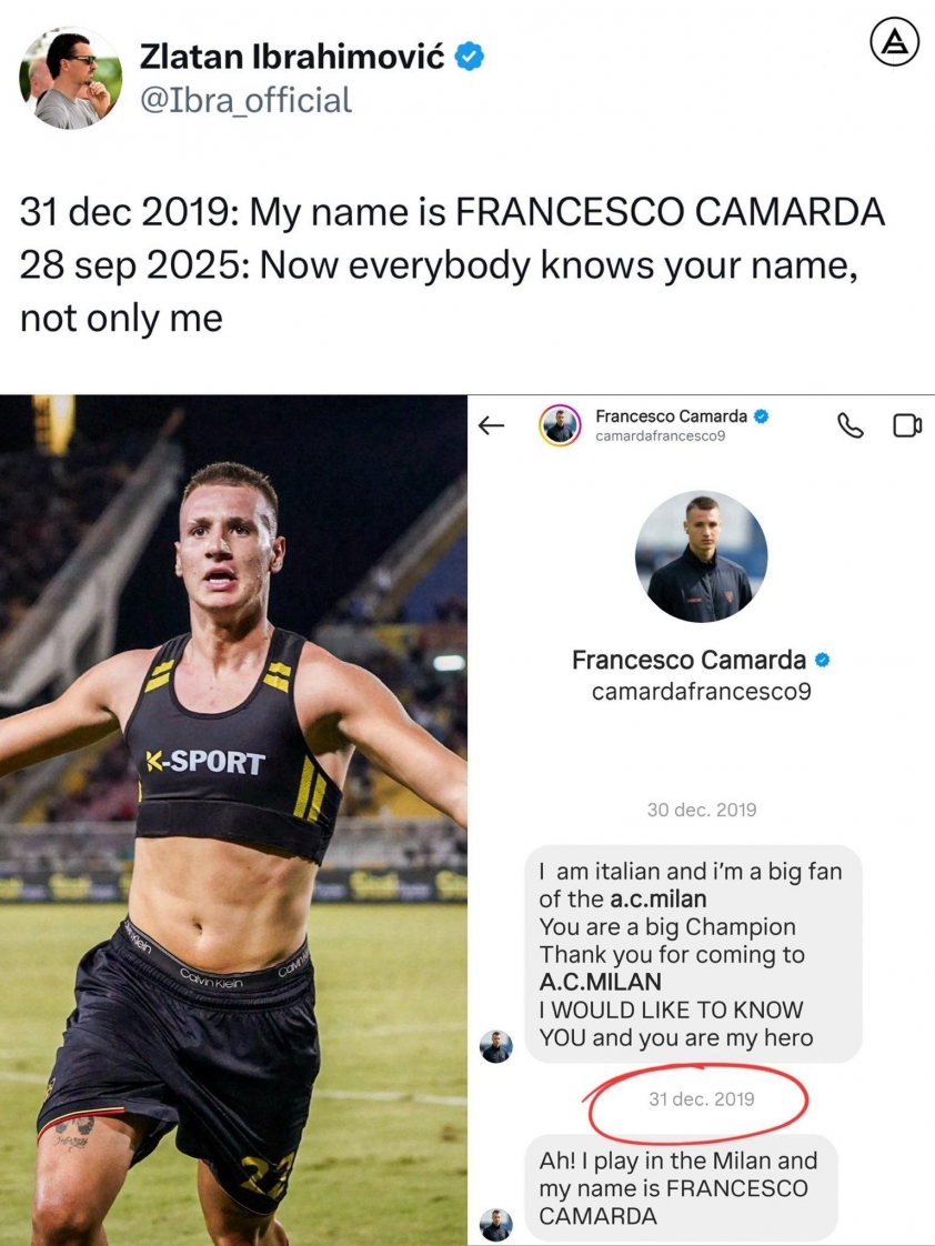 Zlatan chia sẻ trong tuần này: “Tôi chụp hình với cậu ấy khi còn nhỏ, lúc đó tôi chưa biết cậu là ai. Tôi đến Vismare năm 2019 để truyền cảm hứng cho các cầu thủ trẻ. Tôi chỉ nhìn thấy tin nhắn của cậu ấy cách đây một năm, không phải vì kiêu ngạo mà vì tôi ít dùng mạng xã hội. Khi Camarda ghi bàn đầu tiên ở Serie A, tôi mới đăng lại tin nhắn ấy. Tôi thật sự hạnh phúc cho cậu bé. Bóng đá Ý đang cần một số 9 như Camarda.”