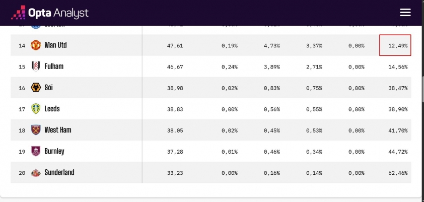 Không chỉ MU, những đội bóng khác cũng đang rơi vào tình trạng báo động. West Ham khởi đầu thảm họa khi để thua Sunderland 0-3 và bị Chelsea vùi dập 5-1. Chính vì vậy, khả năng xuống hạng của họ đã tăng vọt lên tới 41,70%, cao nhất giải. Leeds United (38,90%) và Wolves (38,47%) cũng nằm trong nhóm nguy hiểm.