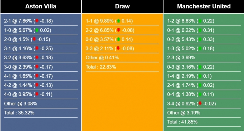 Tỷ số khả dĩ nhất cho chiến thắng của Manchester United là 1-2 với xác suất là 8,63%.Tỷ số khả dĩ thứ hai cho kết quả đó là 0-1 (6,22%) và 0-2 (5,43%). Chiến thắng khả dĩ nhất của Aston Villa là 2-1 (7,86%), trong khi tỷ số hòa là 1-1 (9,89%).