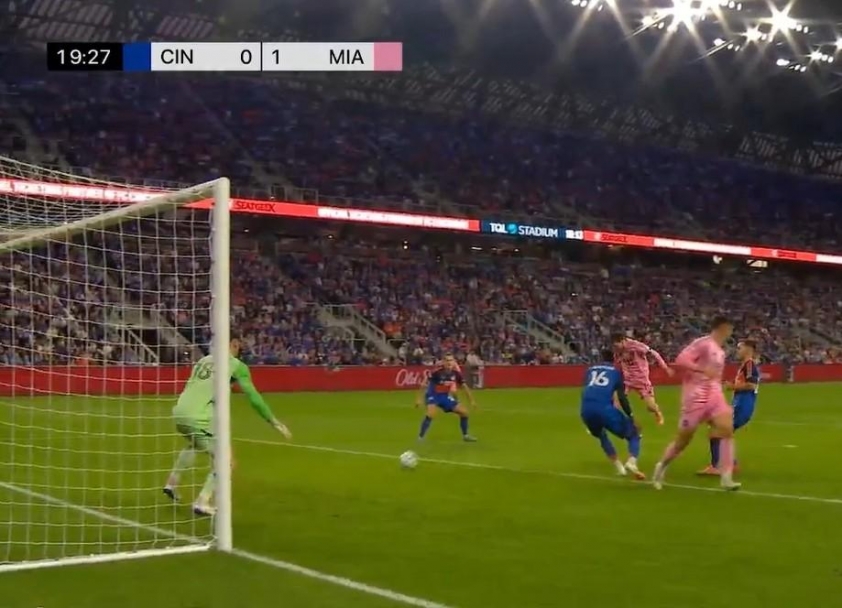Sau khi Messi không thành công ở pha đá phạt trước đó, Cincinnati cố gắng triển khai bóng từ phần sân nhà nhưng Jordi Alba đã băng lên kịp thời và giành lại bóng đầy quan trọng ở khu trung tuyến. Anh lập tức chuyền nhanh cho Messi, người sau đó đổi hướng tấn công sang cánh trái cho Silvetti. Tiền vệ chạy cánh tung đường tạt chính xác vào trung lộ, và Messi băng vào đánh đầu ghi bàn, mở tỷ số cho Inter Miami.