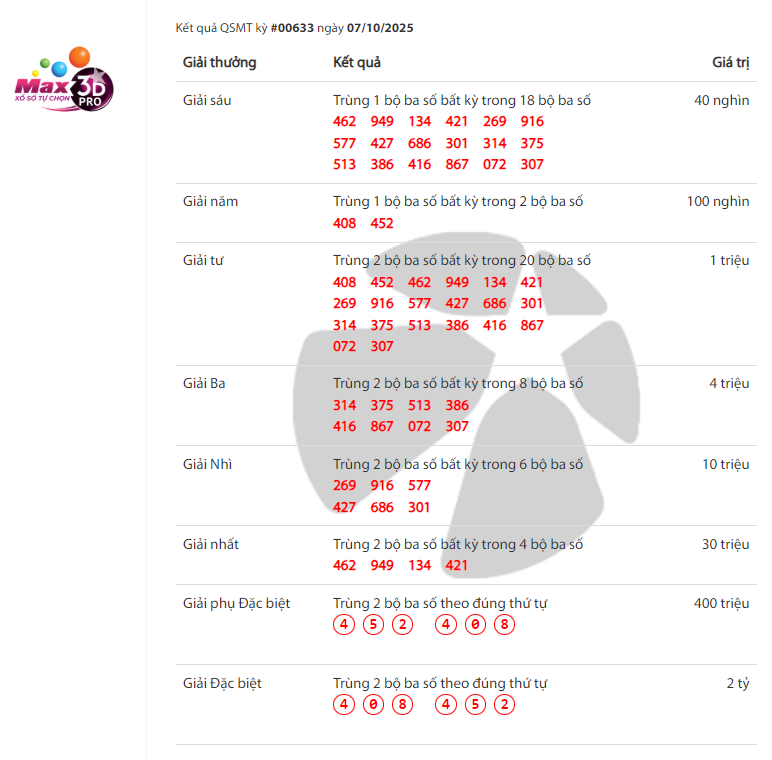 - Cơ cấu giải thưởng Vietlott Max 3D Pro
