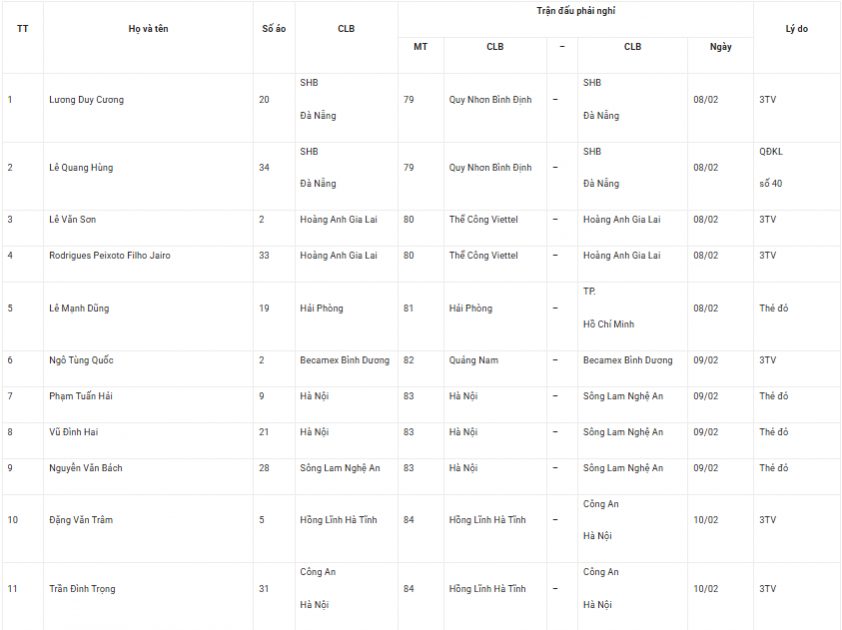 Theo thông báo mới từ ban tổ chức giải đấu, sẽ có tới 11 cầu thủ và 1 quan chức phải ngồi ngoài ở vòng này, một số nhận thẻ đỏ ở trận trước, còn lại nhận đủ 3 thẻ vàng và quyết định kỷ luật từ BTC. Những cái tên không được thi đấu ở vòng 12 bao gồm: Lương Duy Cương, Lê Quang Hùng (SHB Đà Nẵng), Lê Văn Sơn, Jairo Rodrigues (HAGL), Lê Mạnh Dũng (Hải Phòng), Ngô Tùng Quốc (Bình Dương), Phạm Tuấn Hải, Vũ Đình Hai (Hà Nội), Nguyễn Văn Bách (SLNA), Đặng Văn Trâm (Hà Tĩnh) và Trần Đình Trọng (CAHN). Trong khi đó, ông Pena Viegas Luis Filipe, cán bộ phân tích kỹ thuật của CAHN cũng sẽ phải ngồi ngoài do nhận đủ 3 thẻ vàng từ đầu mùa.