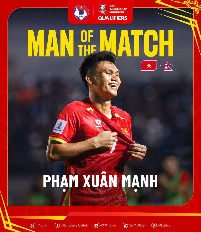 Hậu vệ Phạm Xuân Mạnh được vinh danh là cầu thủ xuất sắc nhất trận đấu với bàn thắng nâng tỉ số lên 2-1 cho đội tuyển Việt Nam.