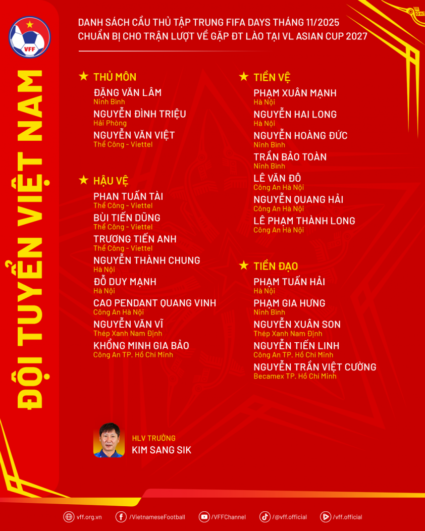 Chiều 6/11, HLV Kim Sang Sik công bố danh sách 23 cầu thủ của ĐT Việt Nam chuẩn bị cho trận đấu gặp Lào vào ngày 18/11 trong khuôn khổ bảng F, vòng loại Asian Cup 2027. Trong đó, bất ngờ với sự trở lại của tiền đạo Nguyễn Xuân Son sau 10 tháng chấn thương nhận được sự quan tâm đặc biệt từ truyền thông và người hâm mộ trong khu vực.