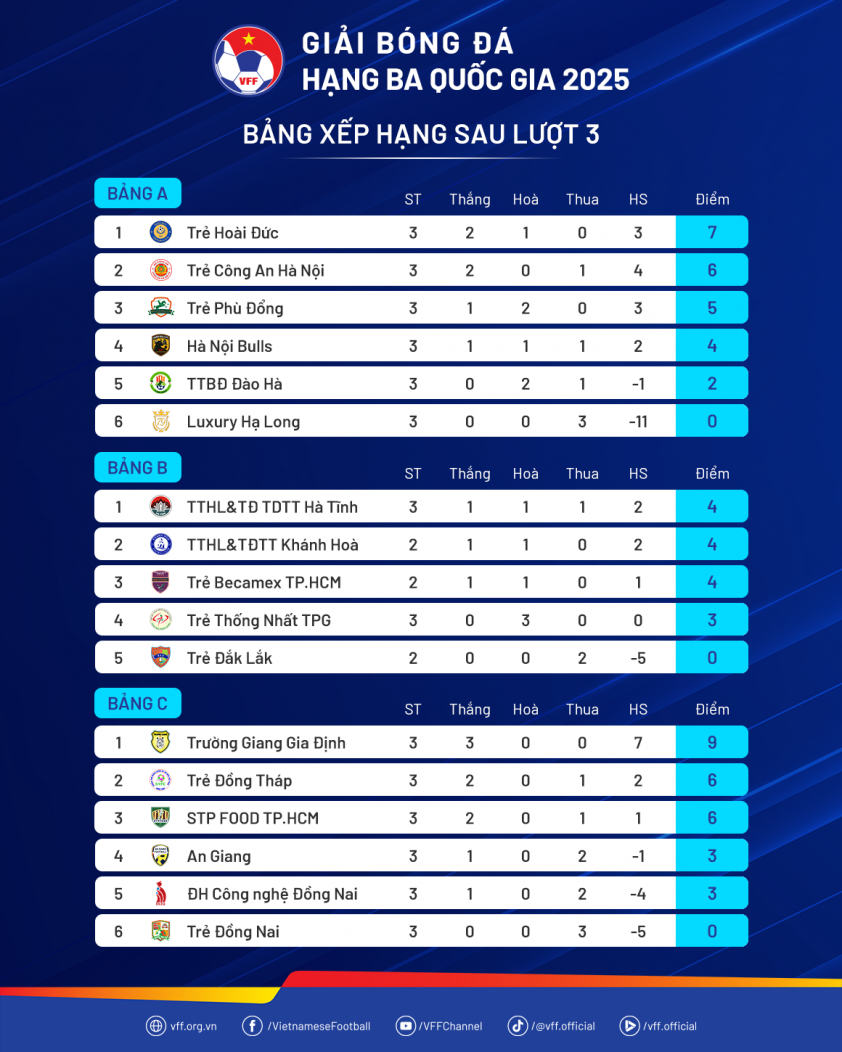 Bảng C chứng kiến nhiều kết quả ấn tượng khi Trường Giang Gia Định tiếp tục thể hiện phong độ thuyết phục với chiến thắng 2-0 trước Trẻ Đồng Tháp, qua đó vững vàng trên ngôi đầu với 9 điểm tuyệt đối.