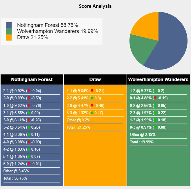 Với các tỷ số có khả năng xảy ra, câu lạc bộ Nottingham Forest thắng lợi 2-1 đạt 9,92%. Hai đội hoà nhau với tỷ số 1-1 đạt 9,84%.Wolves sở hữu 5,37% khả năng đánh bại Nottingham Forest 2-1.