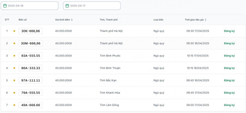 Trong hai ngày 16 và 17/4/2025, Trung tâm Dịch vụ đấu giá tài sản (VPA) sẽ chính thức tổ chức phiên đấu giá công khai với số lượng hơn 20.000 biển số xe ô tô đến từ mọi tỉnh thành trên cả nước.