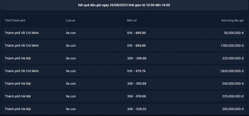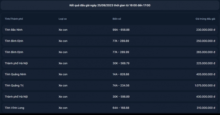 Ca đấu giá "chốt hạ" ngày 25/9 dừng lại với giá trúng cao nhất 1,075 tỷ đồng thuộc về biển số sảnh tiến 74A-234.56.